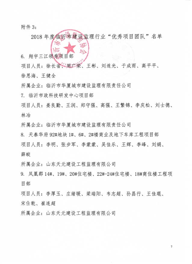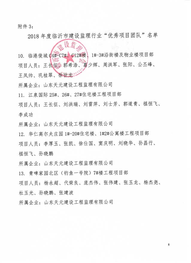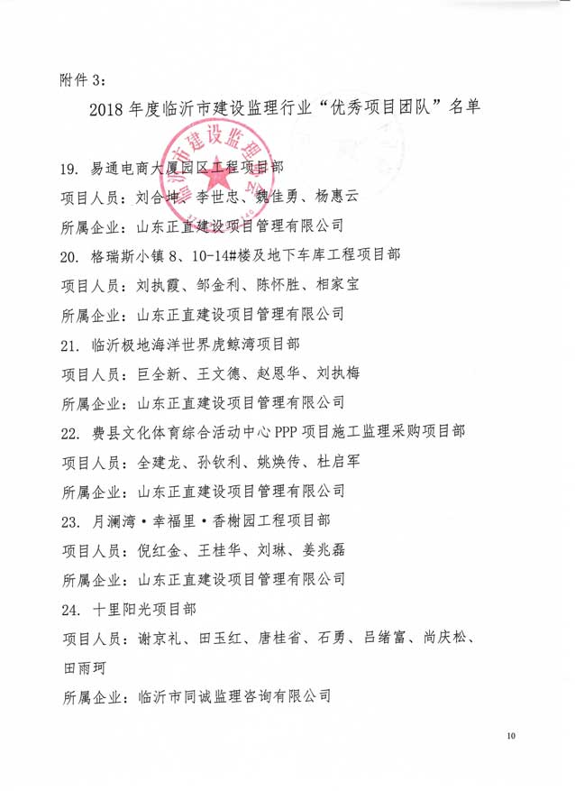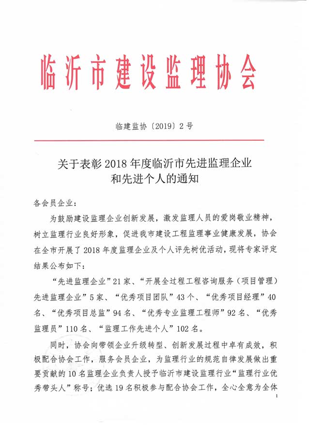 2019年5月,臨沂市建設監(jiān)理協(xié)會發(fā)文表彰2018年度臨沂先進監(jiān)理企業(yè)和先進個人。立信國際工程咨詢(山東)有限公司榮獲“先進監(jiān)理企業(yè)”、“開展全過程工程咨詢服務(項目管理)先進監(jiān)理企業(yè)”榮譽稱號、溪苑蘭亭項目部榮獲“優(yōu)秀項目團隊”榮譽稱號。