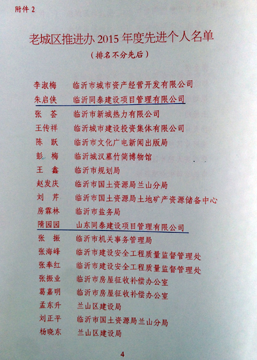 2015年,在臨沂市老城區(qū)重點片區(qū)征收改造協(xié)調推進辦公室領導下,我所選派業(yè)務骨干參與老城區(qū)征收改造和開發(fā)建設工作,發(fā)揚謙虛謹慎、愛崗敬業(yè)、干事創(chuàng)業(yè)、無私奉獻精神,圓滿完成了臨沂市老城區(qū)重點片區(qū)征收改造協(xié)調推進辦公室領導交辦的跟蹤審計、工程咨詢、評估等工作任務,展示出“同泰”人的水平和實力,為事務所創(chuàng)造經(jīng)濟效益。