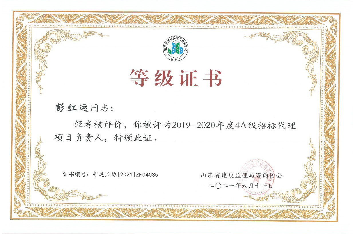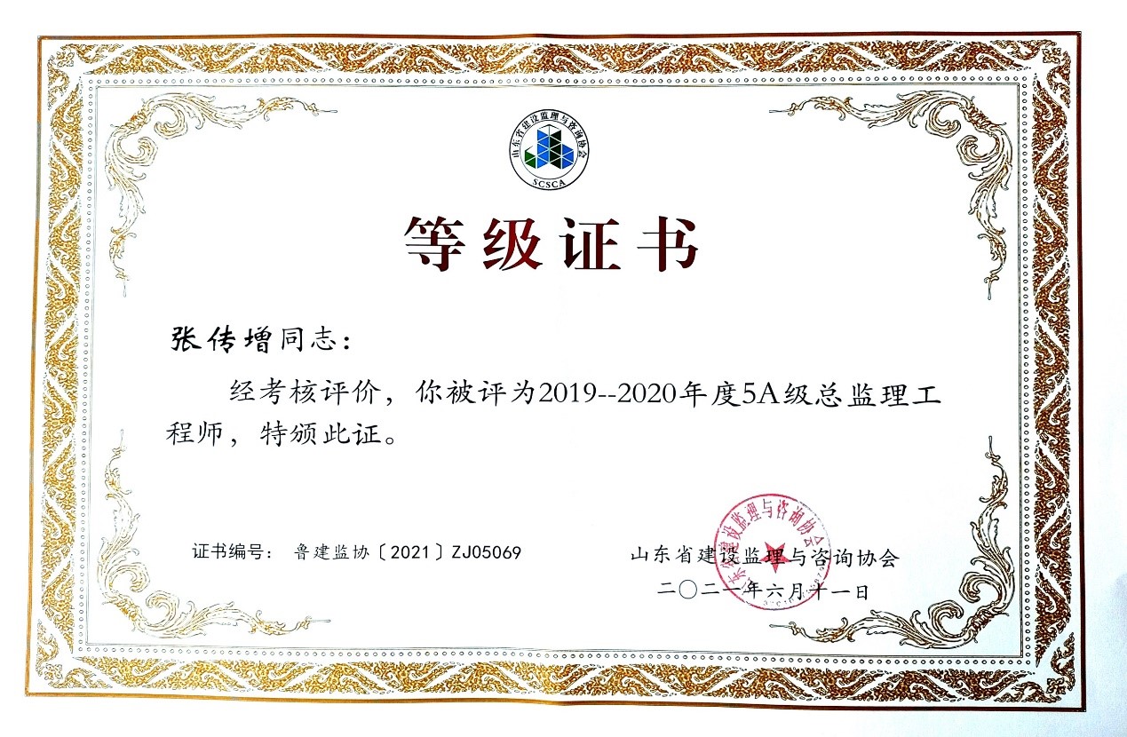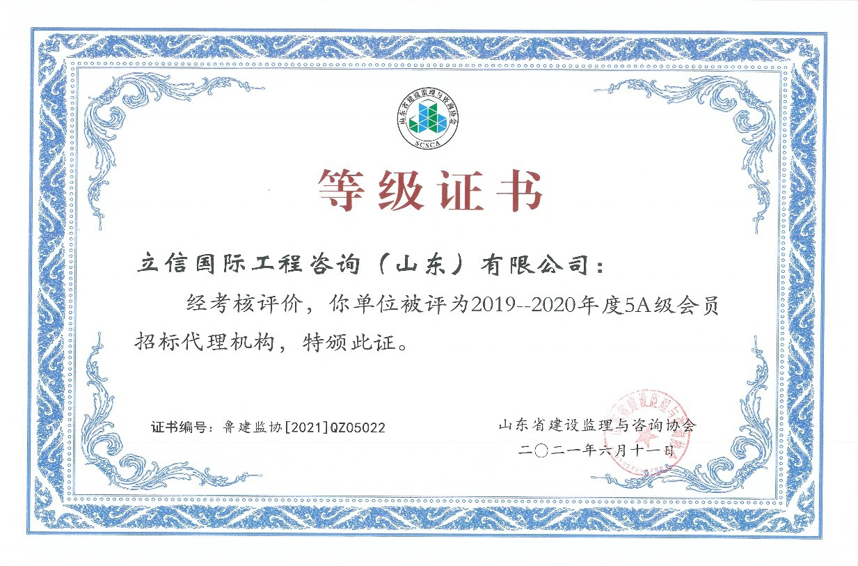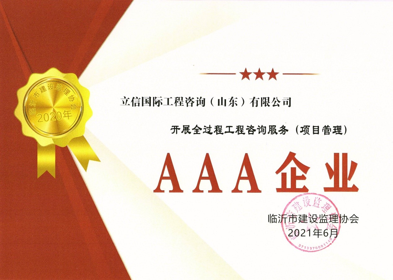 2021年6月,山東省建設(shè)監(jiān)理與咨詢協(xié)會(huì)、臨沂市建設(shè)監(jiān)理協(xié)會(huì)分別開展了有關(guān)全過(guò)程咨詢服務(wù)、監(jiān)理等業(yè)務(wù)的各項(xiàng)綜合考評(píng),立信國(guó)際工程咨詢(山東)有限公司在考評(píng)中獲得較高信用等級(jí)。 在山東省建設(shè)監(jiān)理與咨詢協(xié)會(huì)開展的2019-2020年度全過(guò)程咨詢服務(wù)業(yè)務(wù)會(huì)員單位考核評(píng)價(jià)工作中,我公司被評(píng)選為山東省首批5A級(jí)會(huì)員監(jiān)理企業(yè)、5A級(jí)會(huì)員招標(biāo)代理機(jī)構(gòu)、4A級(jí)全過(guò)程工程咨詢服務(wù)會(huì)員單位。 我公司員工多人被山東省建設(shè)監(jiān)理與咨詢協(xié)會(huì)評(píng)選為2019-2020年度先進(jìn),其中,馬海嘯、張傳增被評(píng)為5A級(jí)總監(jiān)理工程師,高宏、張傳增被評(píng)為5A級(jí)招標(biāo)代理項(xiàng)目負(fù)責(zé)人,呂建建、彭紅運(yùn)被評(píng)為4A級(jí)招標(biāo)代理項(xiàng)目負(fù)責(zé)人。