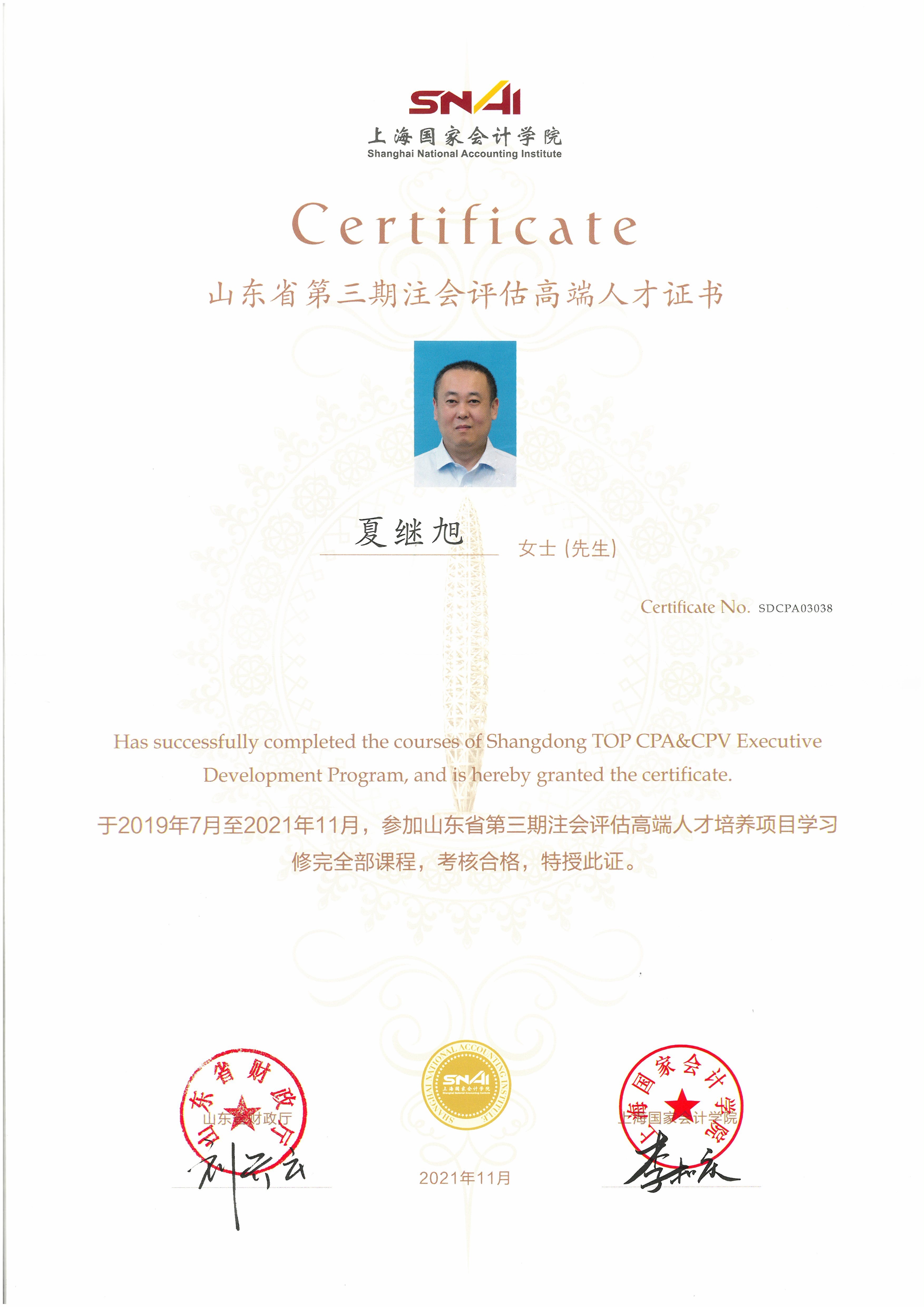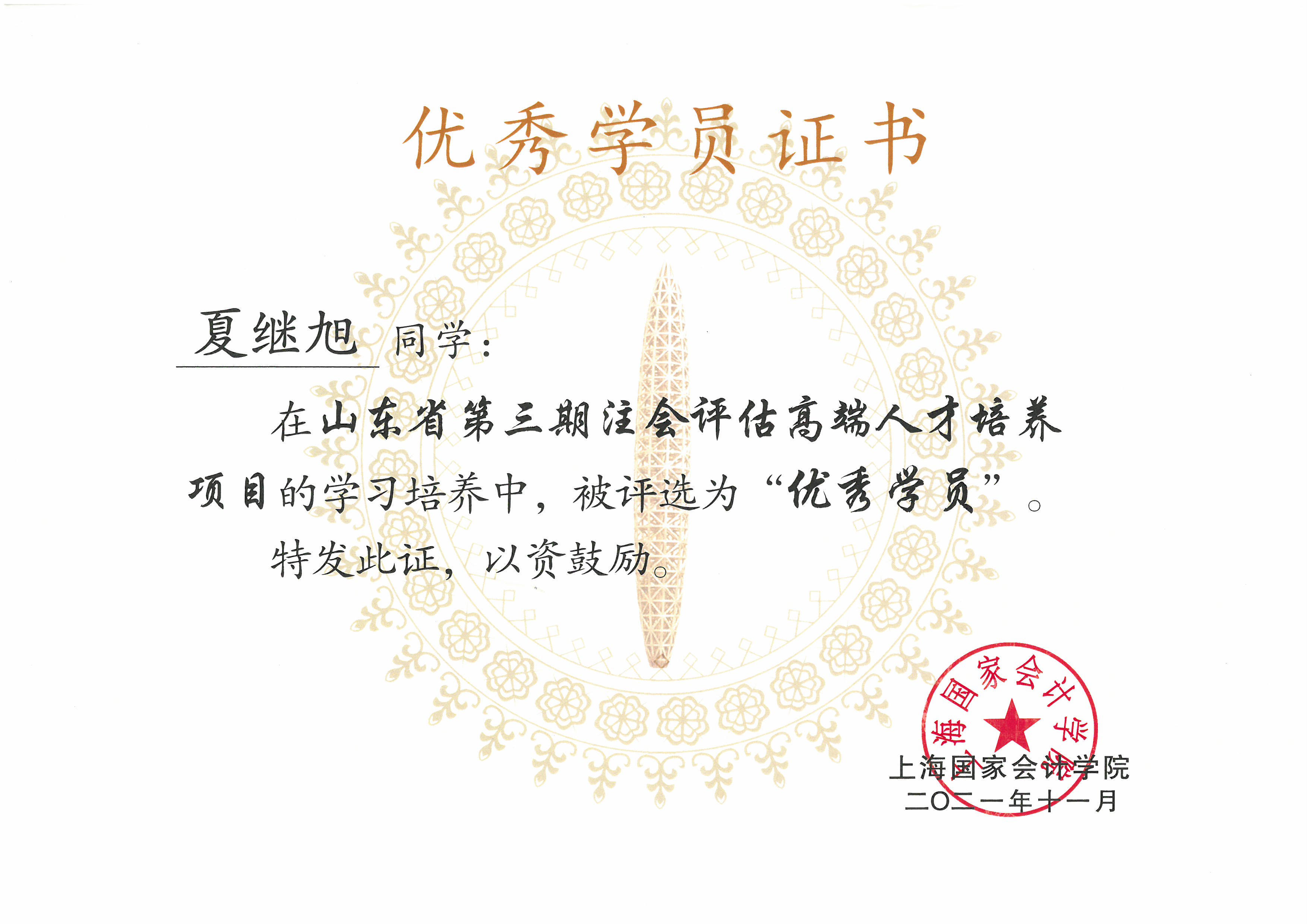 我事務(wù)所陳寶、夏繼旭、孫靜三名同志經(jīng)嚴(yán)格考核選拔為第三期高端人才培訓(xùn)人選,參加了為期三年的培訓(xùn),交出了一份出色的成績(jī)單,正式成為省高端人才,夏繼旭同志被評(píng)為優(yōu)秀學(xué)員。