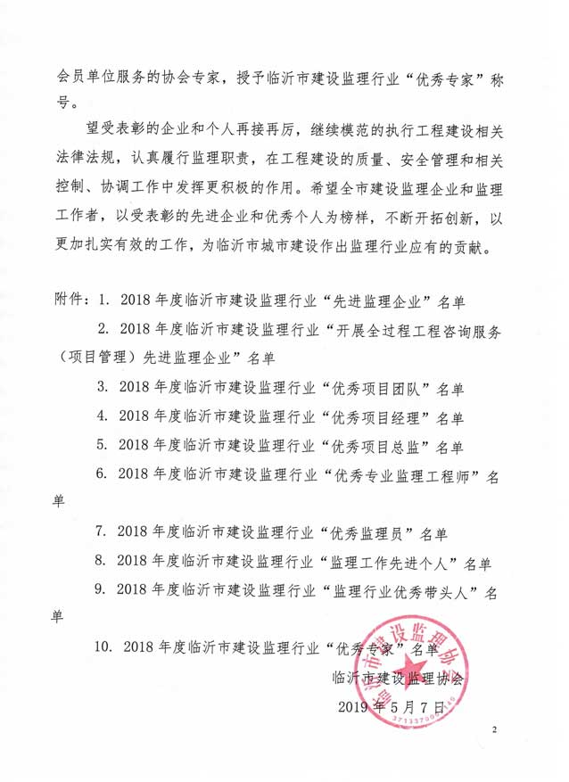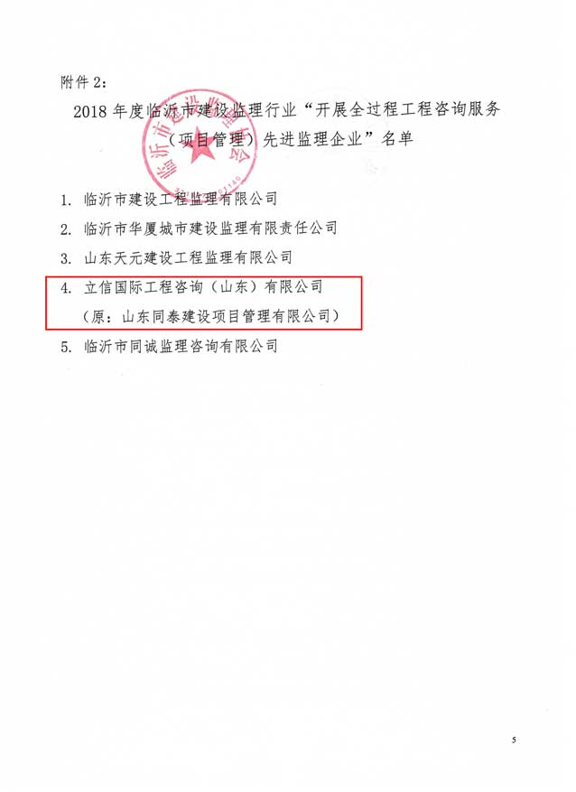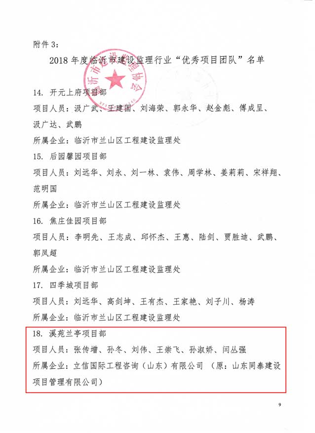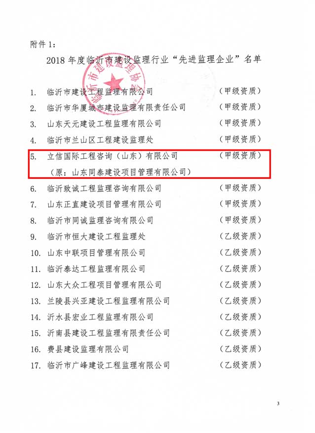 2019年5月,臨沂市建設監(jiān)理協(xié)會發(fā)文表彰2018年度臨沂先進監(jiān)理企業(yè)和先進個人。立信國際工程咨詢(山東)有限公司榮獲“先進監(jiān)理企業(yè)”、“開展全過程工程咨詢服務(項目管理)先進監(jiān)理企業(yè)”榮譽稱號、溪苑蘭亭項目部榮獲“優(yōu)秀項目團隊”榮譽稱號。