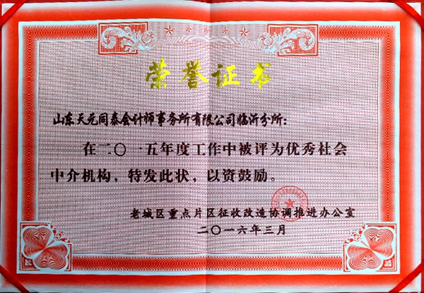 | 祝賀“同泰”獲臨沂市老城區(qū)推進辦“2015年度優(yōu)秀中介機構”! |
