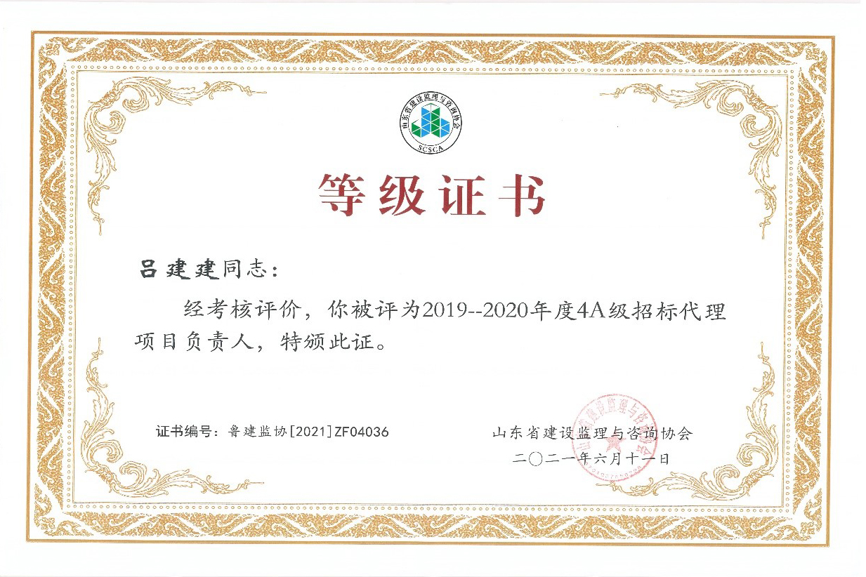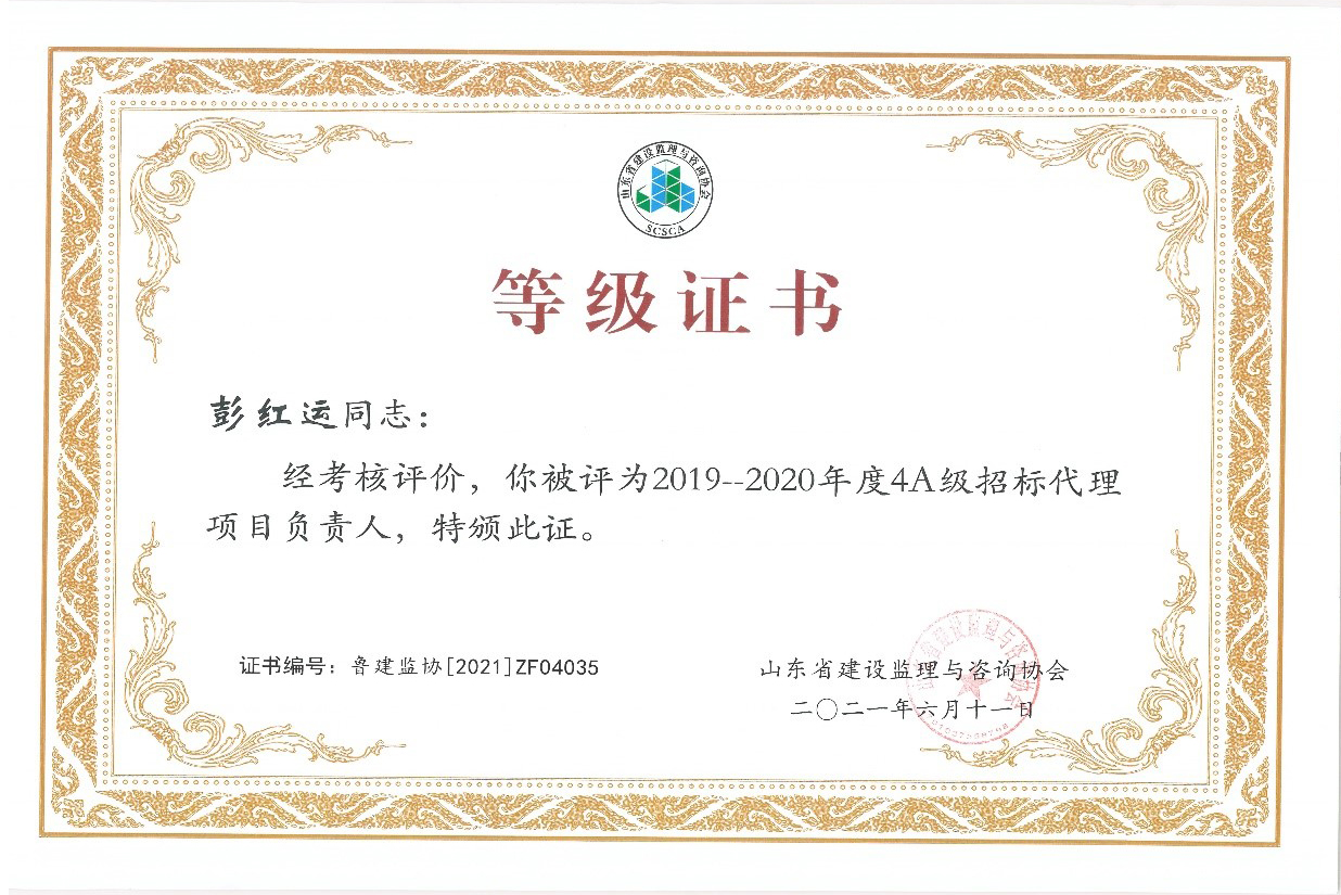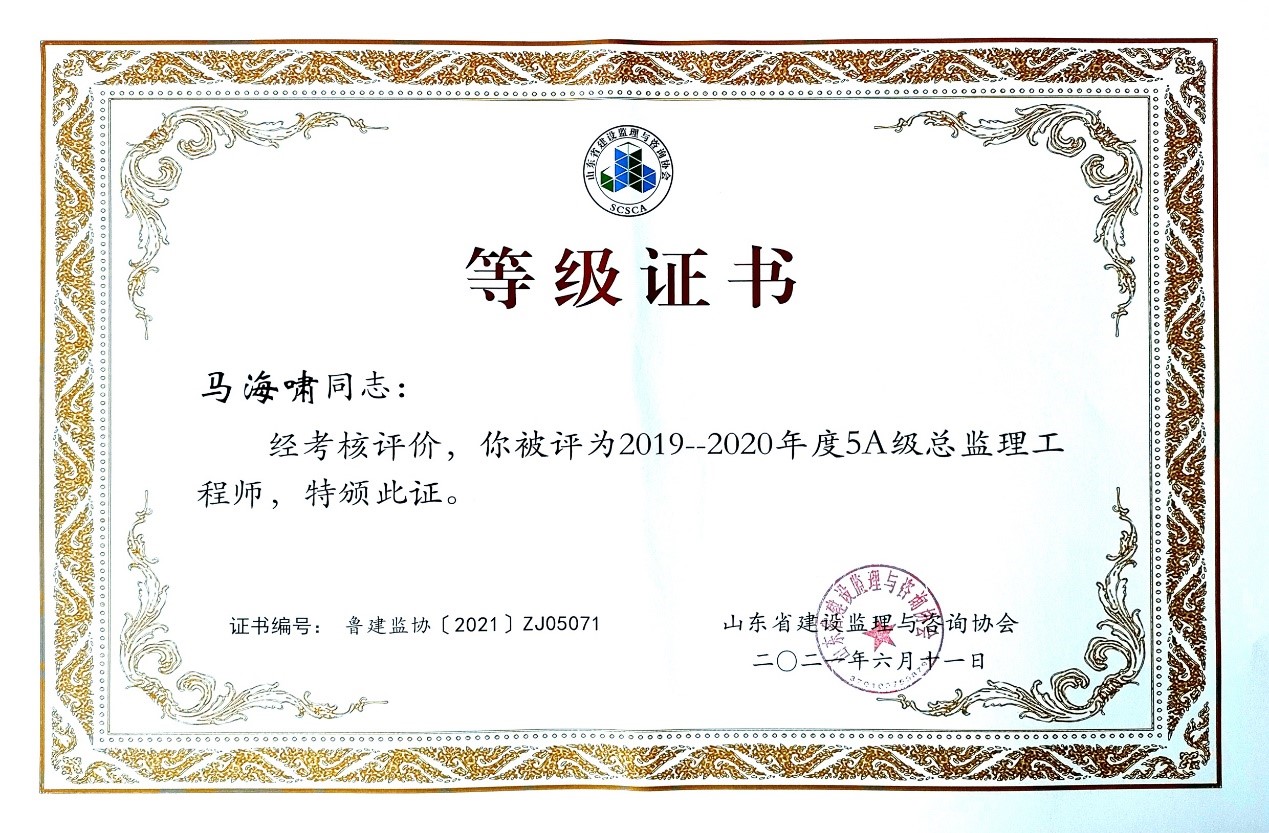 2021年6月,山東省建設(shè)監(jiān)理與咨詢協(xié)會(huì)、臨沂市建設(shè)監(jiān)理協(xié)會(huì)分別開展了有關(guān)全過(guò)程咨詢服務(wù)、監(jiān)理等業(yè)務(wù)的各項(xiàng)綜合考評(píng),立信國(guó)際工程咨詢(山東)有限公司在考評(píng)中獲得較高信用等級(jí)。 在山東省建設(shè)監(jiān)理與咨詢協(xié)會(huì)開展的2019-2020年度全過(guò)程咨詢服務(wù)業(yè)務(wù)會(huì)員單位考核評(píng)價(jià)工作中,我公司被評(píng)選為山東省首批5A級(jí)會(huì)員監(jiān)理企業(yè)、5A級(jí)會(huì)員招標(biāo)代理機(jī)構(gòu)、4A級(jí)全過(guò)程工程咨詢服務(wù)會(huì)員單位。 我公司員工多人被山東省建設(shè)監(jiān)理與咨詢協(xié)會(huì)評(píng)選為2019-2020年度先進(jìn),其中,馬海嘯、張傳增被評(píng)為5A級(jí)總監(jiān)理工程師,高宏、張傳增被評(píng)為5A級(jí)招標(biāo)代理項(xiàng)目負(fù)責(zé)人,呂建建、彭紅運(yùn)被評(píng)為4A級(jí)招標(biāo)代理項(xiàng)目負(fù)責(zé)人。