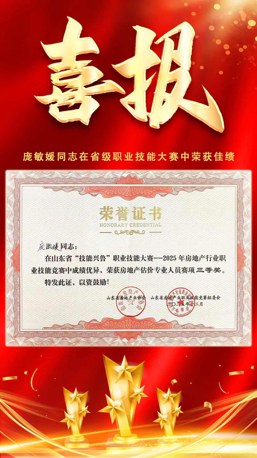 近日,在山東省“技能興魯”職業(yè)技能大賽——2025年房地產(chǎn)行業(yè)職業(yè)技能競賽中,我單位龐敏媛同志憑借扎實的專業(yè)知識、精湛的業(yè)務(wù)技能和出色的現(xiàn)場發(fā)揮,榮獲房地產(chǎn)估價專業(yè)人員賽項三等獎。 本次競賽由山東省房地產(chǎn)業(yè)協(xié)會與山東省房地產(chǎn)職業(yè)技能競賽組委會聯(lián)合舉辦,旨在推動行業(yè)高技能人才隊伍建設(shè),弘揚工匠精神,提升房地產(chǎn)行業(yè)整體服務(wù)水平。競賽吸引了全省眾多行業(yè)精英參與,競爭激烈。龐敏媛同志在比賽中沉著應(yīng)戰(zhàn)、穩(wěn)定發(fā)揮,展現(xiàn)了優(yōu)秀的職業(yè)素養(yǎng)和專業(yè)能力,最終從眾多選手中脫穎而出,獲得殊榮。這不僅是她個人專業(yè)能力的體現(xiàn),也是我單位注重人才培養(yǎng)、強化專業(yè)技能訓(xùn)練的成果。 希望龐敏媛同志珍惜榮譽、再接再厲,繼續(xù)發(fā)揮專業(yè)優(yōu)勢,在崗位上再創(chuàng)佳績。同時,也希望全體同仁以她為榜樣,不斷提升專業(yè)技能,共同推動行業(yè)高質(zhì)量發(fā)展!